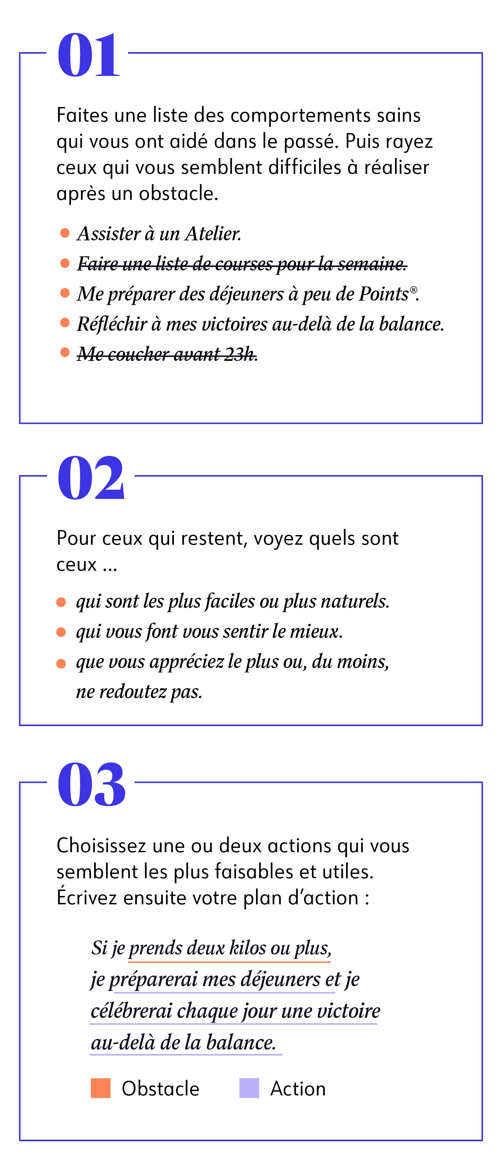 N’oubliez pas que tout le monde rencontre des obstacles. Ce qui compte, c'est comment vous allez les surmonter. Décider à l’avance des stratégies à adopter (car vous savez qu’elles sont efficaces et fonctionnent pour vous) vous aidera à voir les difficultés comme des obstacles à surmonter, et non comme la fin de votre parcours