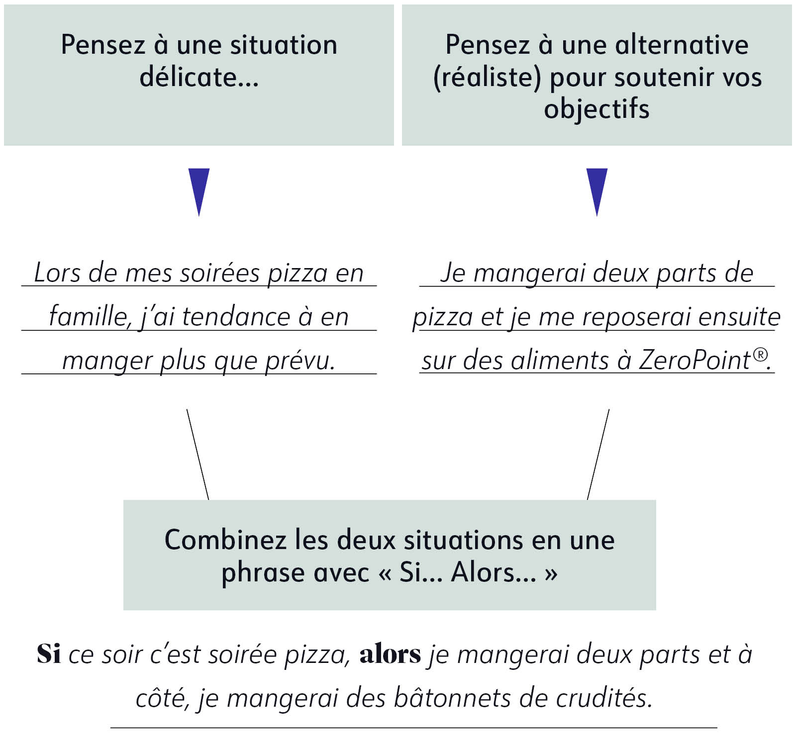 La solution : anticiper les décisions en mettant en place un schéma sous forme de « Si… Alors… ». En décidant à l’avance comment vous allez gérer une situation délicate, vous n’aurez pas besoin de réfléchir sur le moment. Assurez-vous juste que votre « Alors… » est réaliste et faisable pour vous. Si, au contraire, vous esquivez totalement les soirées pizza, vous risquez de vous sentir frustré et ce ne sera pas maintenable sur le long-terme. Mais en prévoyant de déguster deux parts et d’avoir un plan si vous avez encore faim, vous pouvez quasiment déjà pré-célébrer votre réussite !