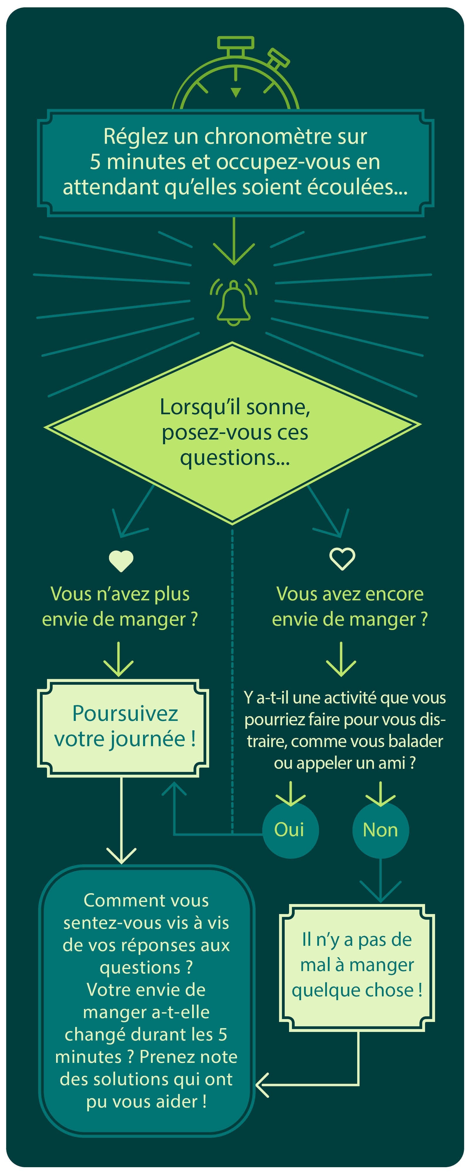 Le fait d'attendre cinq minutes avant de vous jeter sur de la nourriture vous permet de prendre un peu de recul (même si vous ne faites qu'aller sur les réseaux sociaux, ou que plier du linge). Mais rappelez-vous : si vous mangez quand même après que le temps soit écoulé, il n'y a pas de mal ! Le but n'est pas de vous empêcher de manger, mais de vos anciennes habitudes par des habitudes saines.