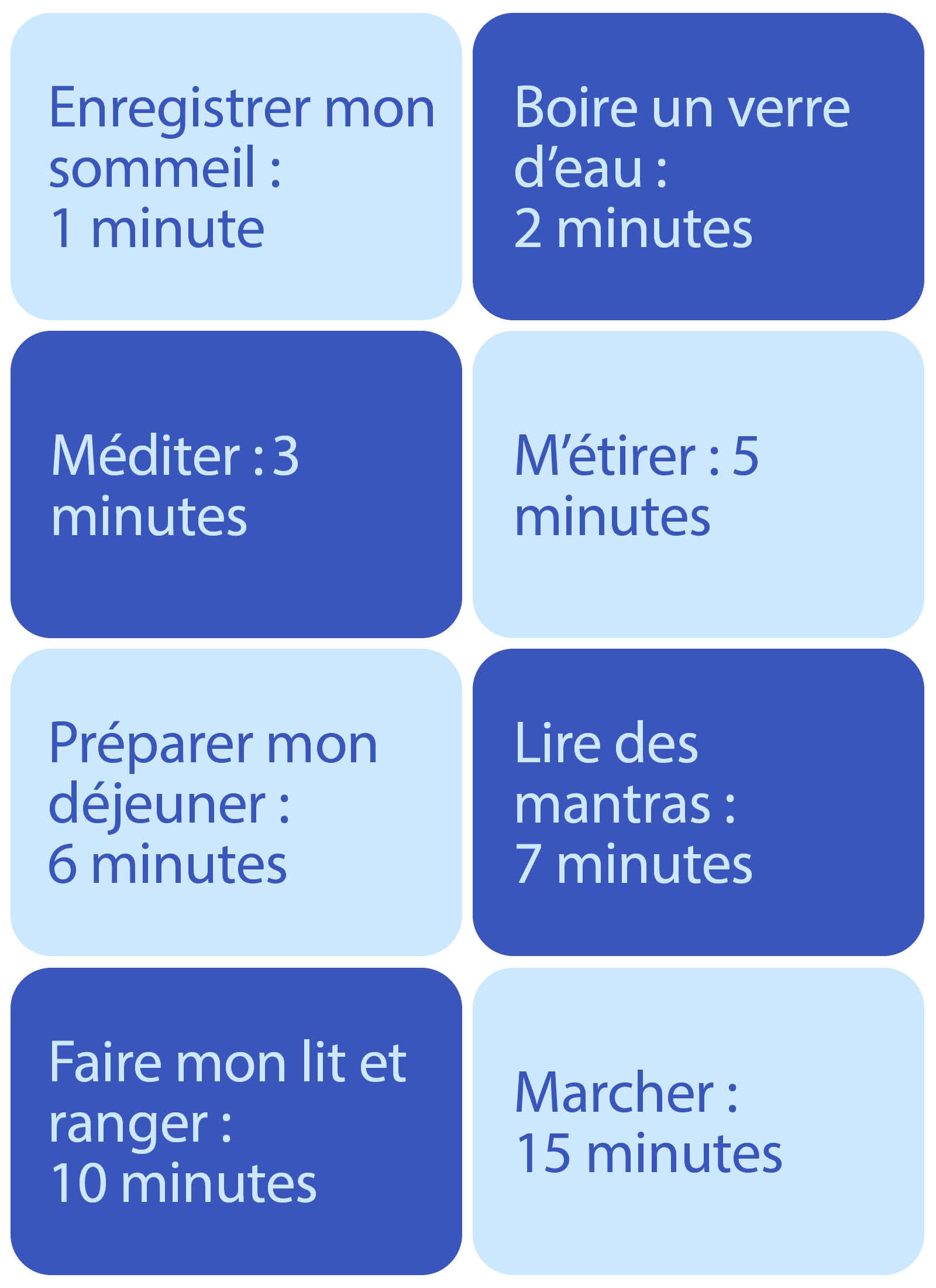 3. Choisissez-en une ou deux et réfléchissez à comment les insérer dans votre routine. Peut-être que vous devrez vous lever un peu plus tôt, troquer une action pour une autre, ou en associer plusieurs.