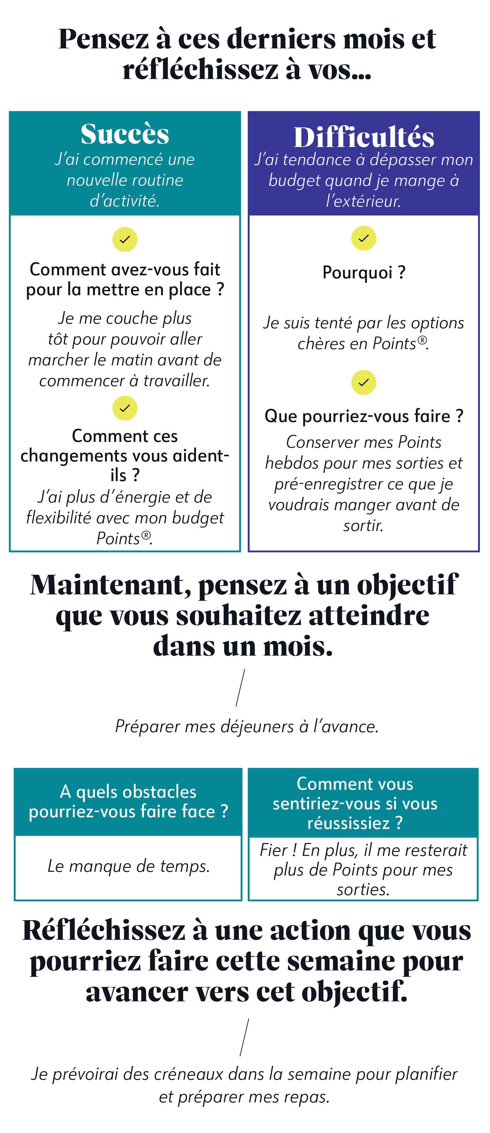 Le fait de réfléchir à vos réussites et à vos difficultés, c’est-à-dire pourquoi certaines choses se sont bien passées et d’autres non, peut vous guider vers vos objectifs. Alors prenez le temps de réfléchir à vos expériences passées régulièrement, et à chaque fois que vous vous fixez un nouvel objectif, afin de définir la meilleure façon d’avancer.