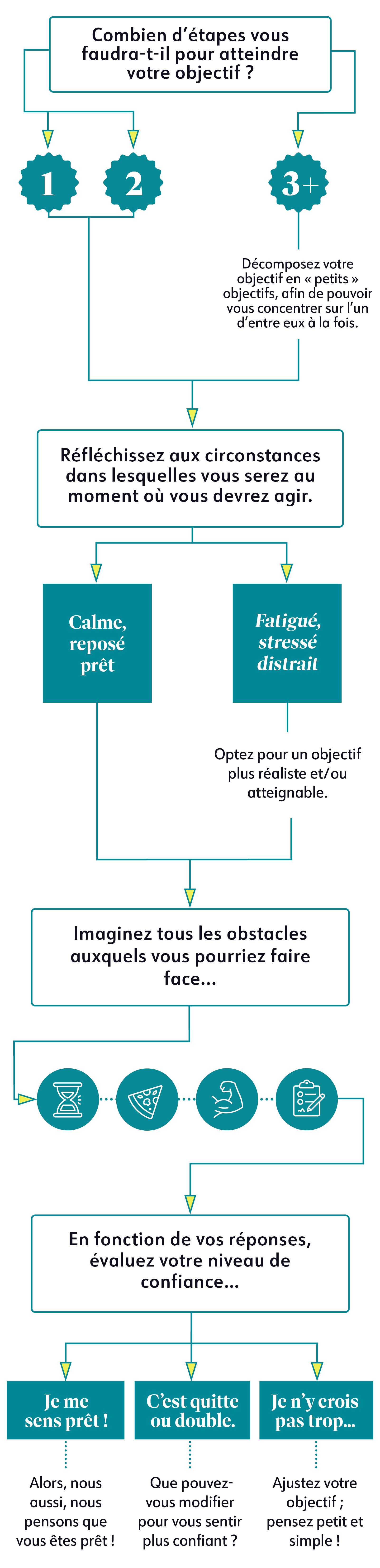 Mais pas de panique ! Il est possible de combler ce fossé grâce à cette technique ! En vous fixant des objectifs atteignables, puis en réfléchissant aux circonstances dans lesquelles vous agirez, ainsi que votre état d’esprit, vous serez dans la mesure de vous fixer des objectifs concrets et faisables. Au lieu de vous dire que vous ne faites jamais ce que vous prévoyez de faire, vous célébrerez le fait d'atteindre vos objectifs !