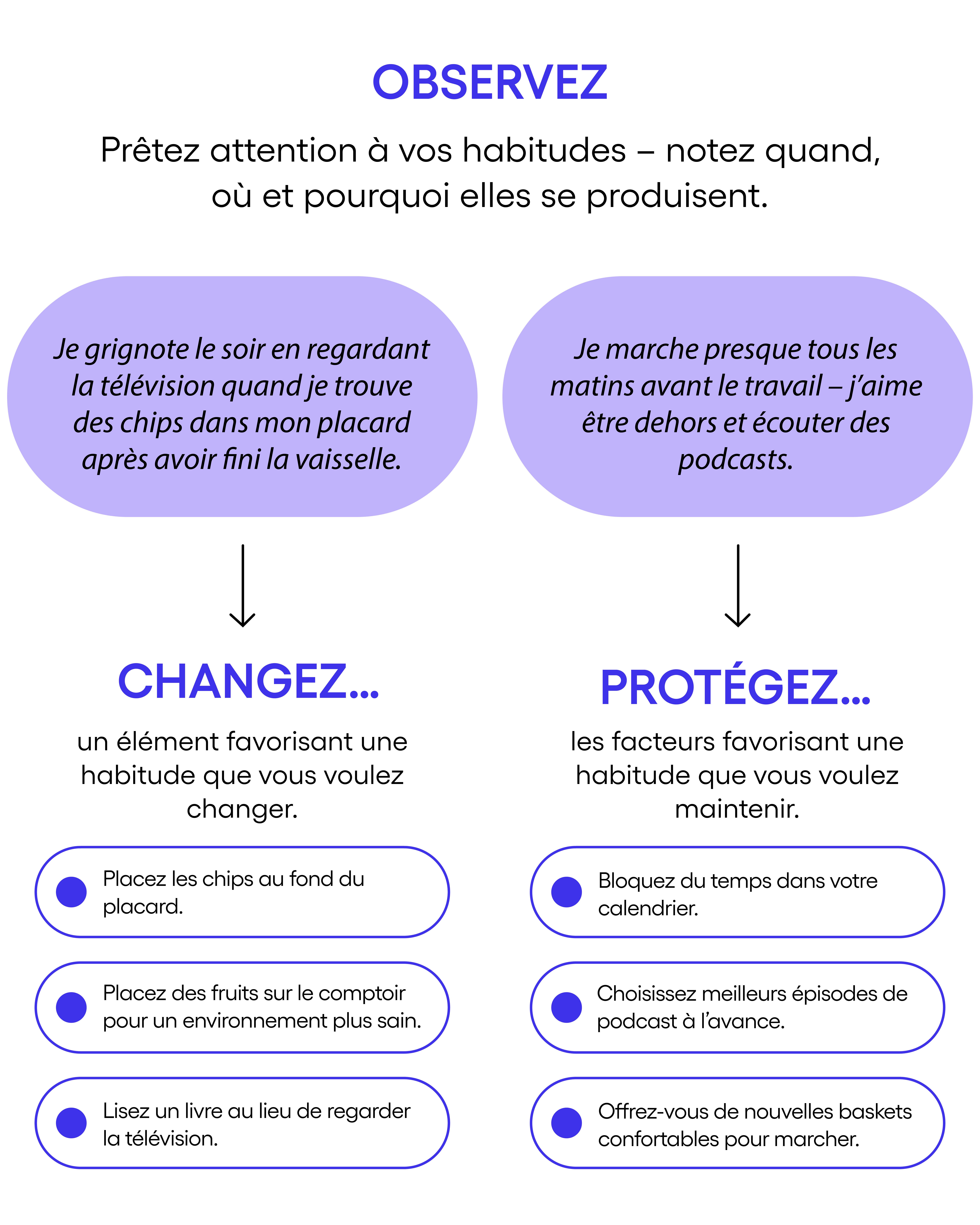 Prêter attention à ce qui se passe avant ou après une habitude (par exemple ce qui la déclenche, le moment ou l’endroit où elle se produit mais aussi vos sentiments et vos pensées) peut vous aider à comprendre ce qui l’enclenche et lui permet de persister. Prendre conscience de cela peut vous permettre de protéger les facteurs qui favorisent vos bonnes habitudes ou, dans le cas des habitudes que vous souhaitez laisser derrière vous, de les interrompre et de mettre fin à ce comportement.