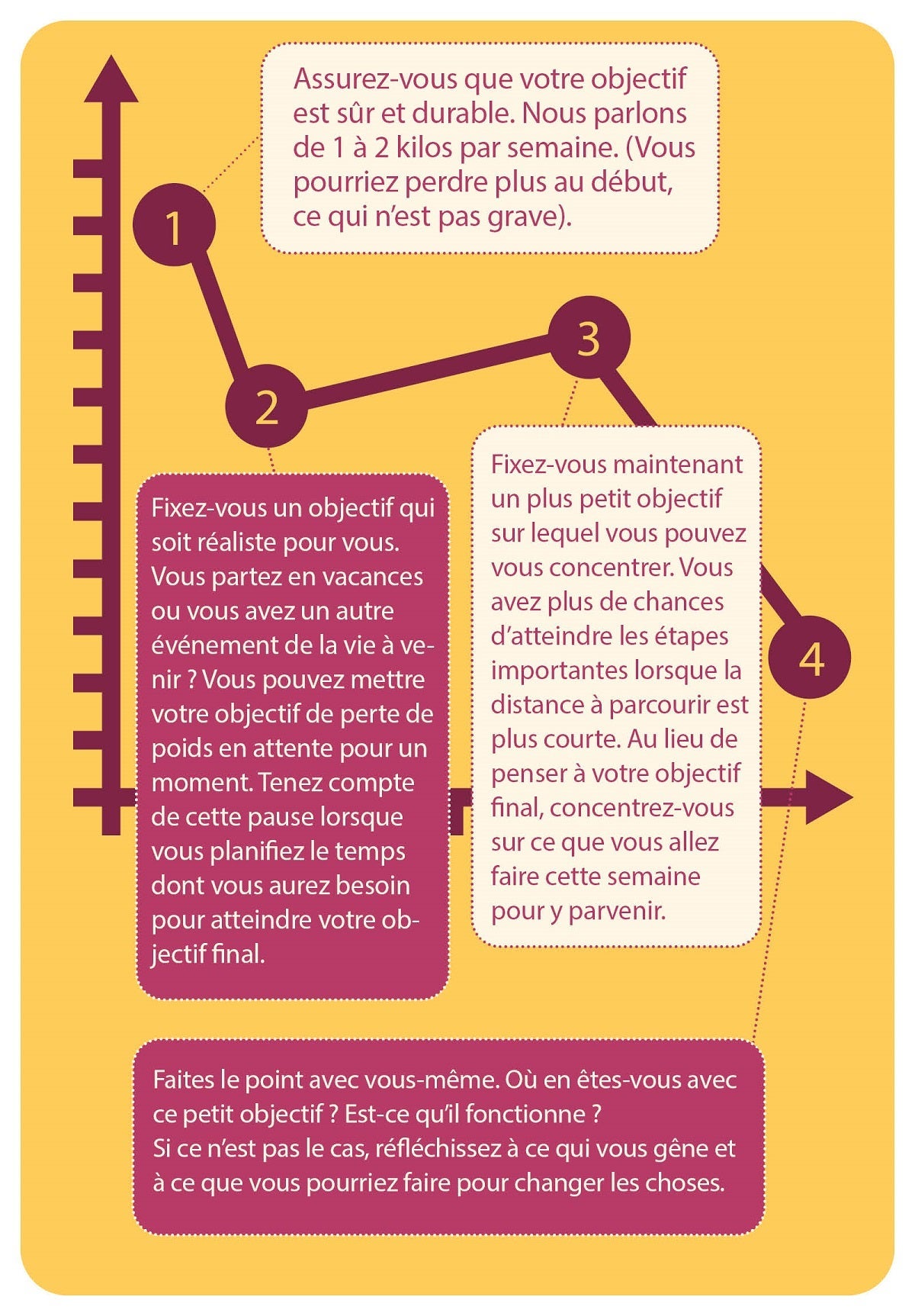 Il est normal de vouloir voir s'afficher son poids de rêve sur la balance. Mais pour arriver à cela, vous n'êtes pas obligé de tout faire en même temps. Pensez-y de la manière suivante : courriez-vous un marathon du premier coup ? Probablement pas. Vous diviseriez ce long parcours en plusieurs petites distances qui finiraient par s'additionner pour atteindre l'arrivée.