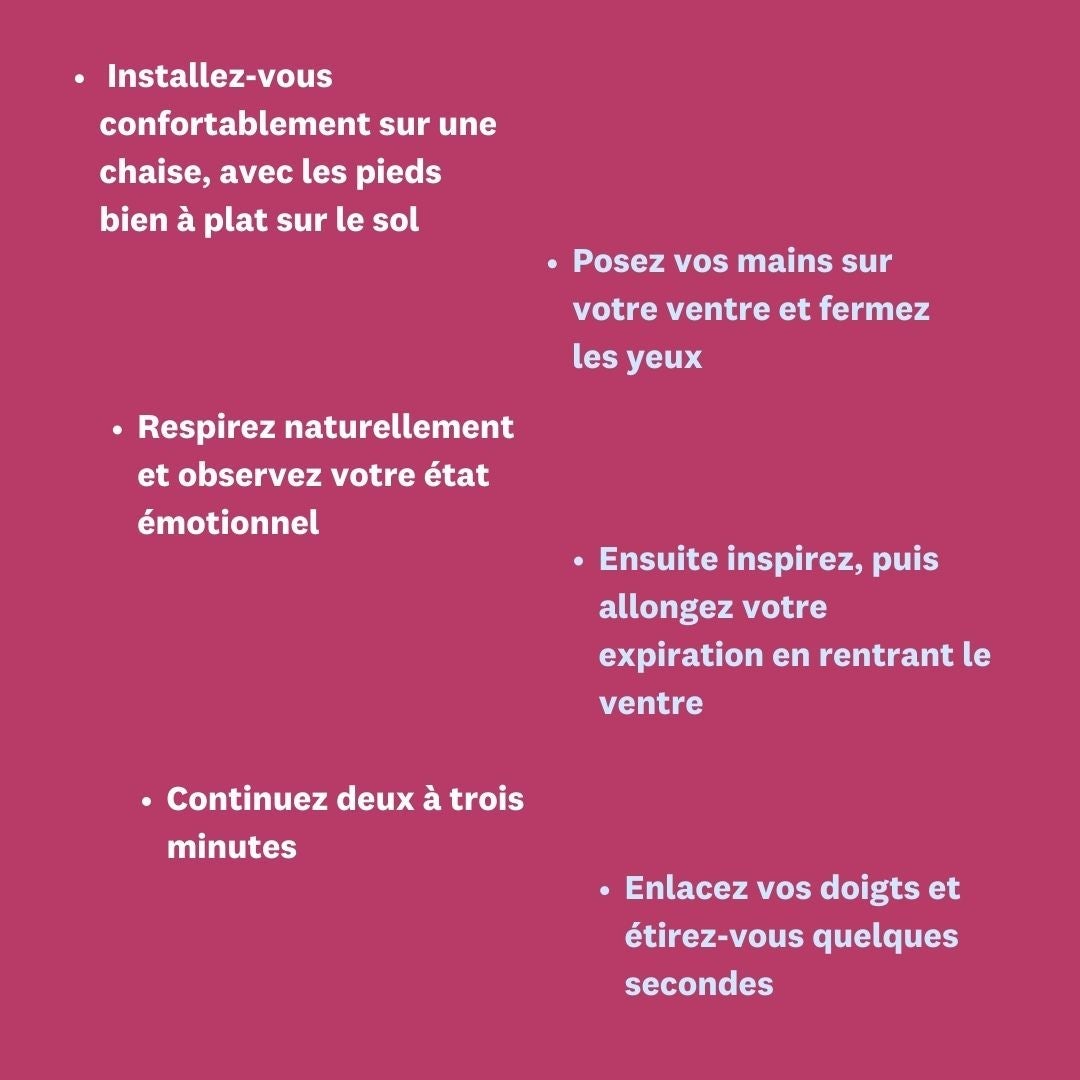 Pour vous aider à ne pas vous sentir stressé le soir, Nelly Sebon suggère d’observer son état émotionnel au cours de la journée. Si vous vous sentez stressé, prenez quelques minutes pour vous détendre. Cet exercice simple peut se faire à tout moment et autant de fois que nécessaire :