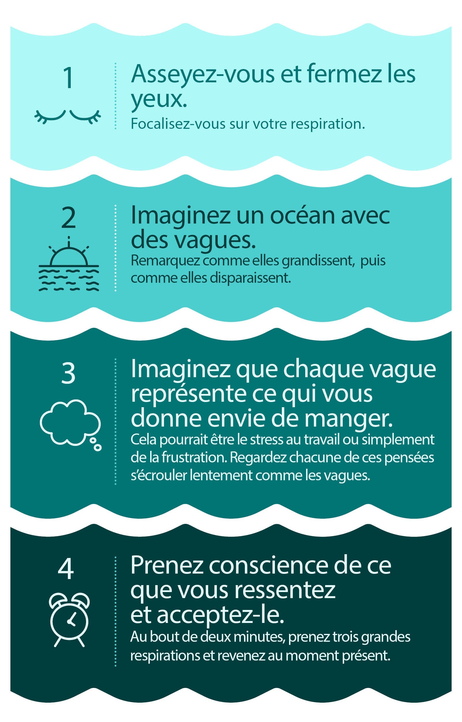 Le clé du succès est d'apprendre à réagir dans ces situations. Cela ne veut pas dire que la petite méditation que nous venons de vous proposer est une solution permanente. Mais reconnaître et accepter ce qui vous donne envie de manger est déjà la première étape pour reprendre le contrôle de votre alimentation.