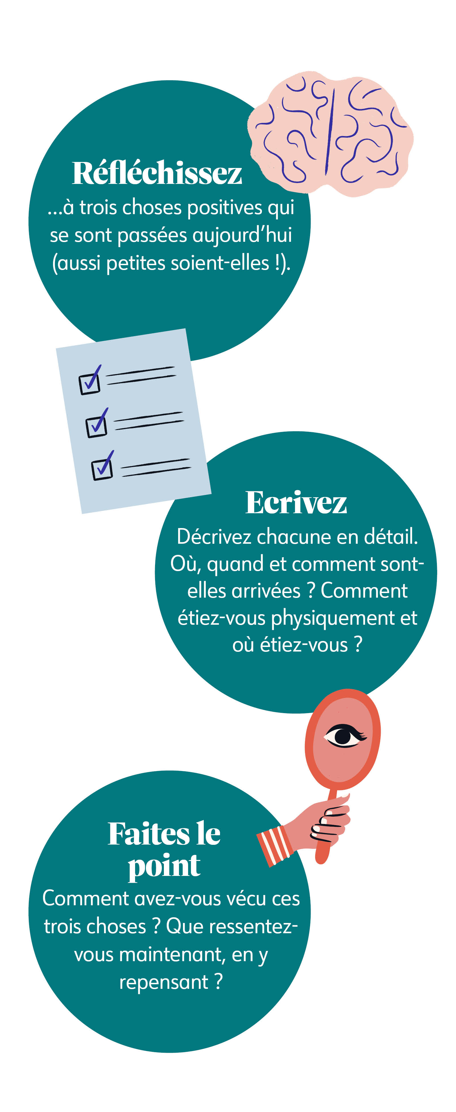 Si vous avez du mal à trouver des choses positives durant les prochains jours, semaines ou même des prochains mois, pas d’inquiétude ! Continuez à chercher sans vous mettre la pression et vous verrez, cet exercice deviendra de plus en plus facile. Plus vous le ferez, plus vous vous apercevrez que la gratitude deviendra automatique.