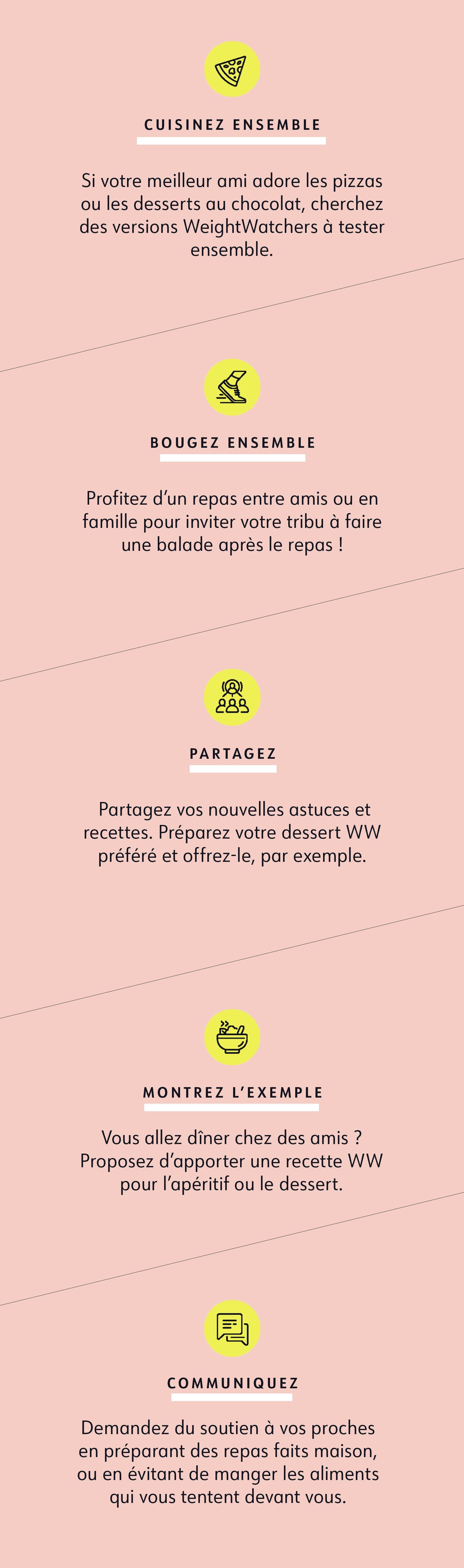 En plus de vous apporter du soutien, vous pourrez vous sentir plus connecté à vos proches (...ce qui fait du bien en cette période de fin d'année stressante !). Vous aurez ainsi une approche plus positive de votre parcours de perte de poids, même pendant les fêtes.