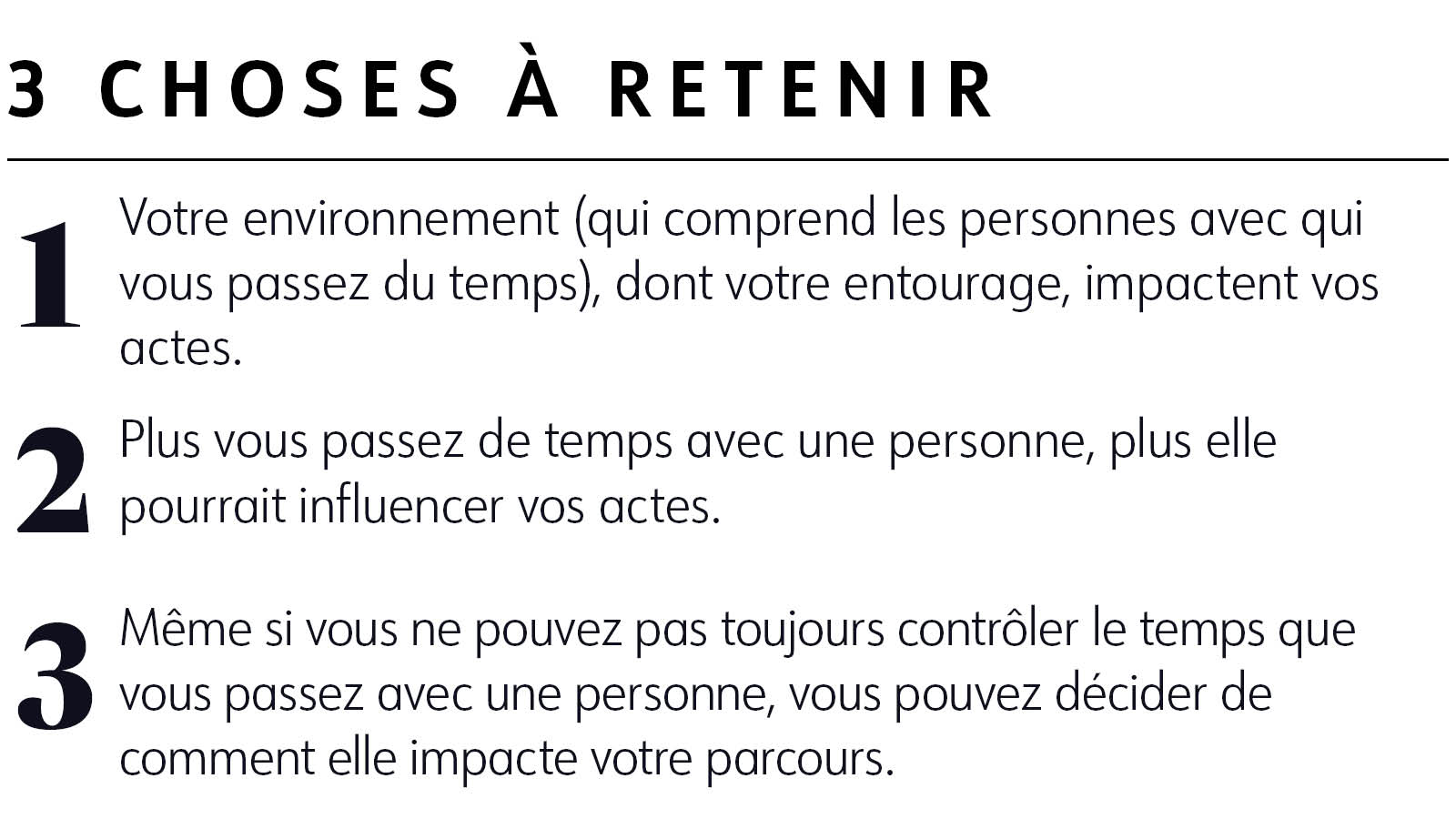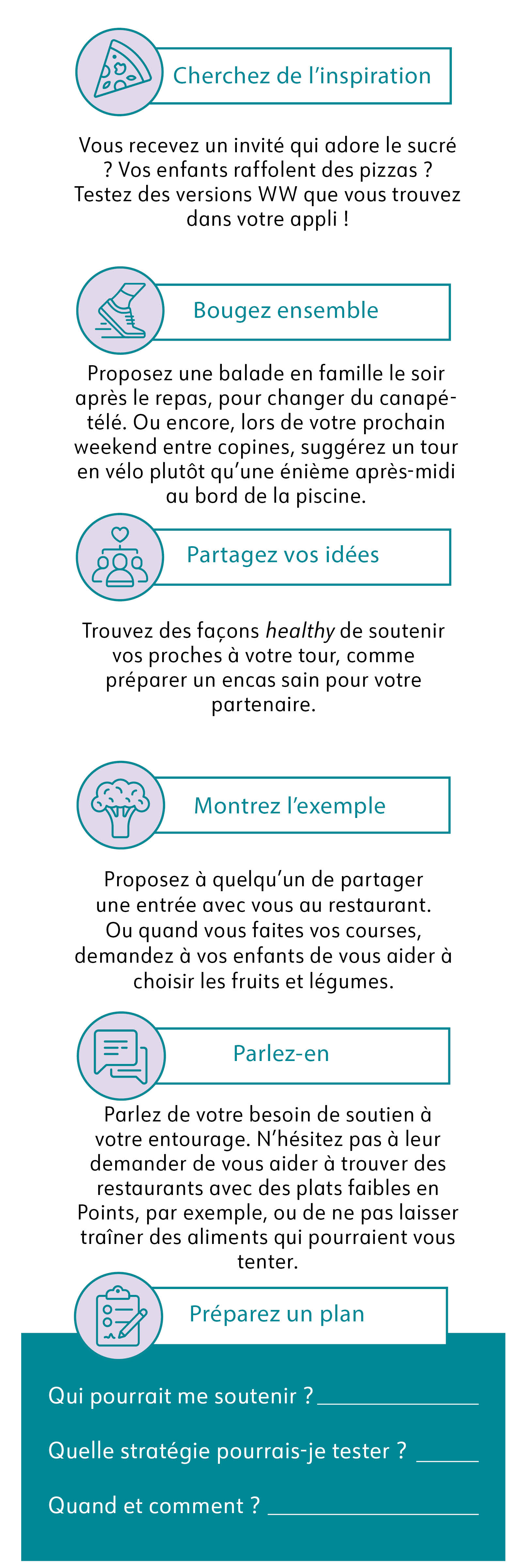 Au lieu d’affronter ce phénomène, voici comment surfer sur la vague : incluez votre entourage dans votre parcours. Des recherches scientifiques ont démontré que les personnes qui recevaient du soutien de leurs proches perdaient du poids plus facilement. Certes, vous ne pouvez pas contrôler ce que font les autres, mais il y a de grandes chances qu’ils voudront vous soutenir. Alors ouvrez-leur la voie !