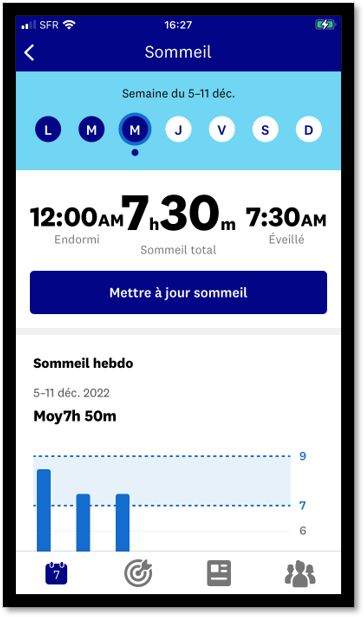 Saviez-vous que vous pouvez suivre votre sommeil avec l’Appli WeightWatchers, de la même manière que pour les aliments et l’activité physique ! Pour cela, tapotez la croix bleue ou les trois lignes en haut à gauche de votre écran et choisissez Sommeil.