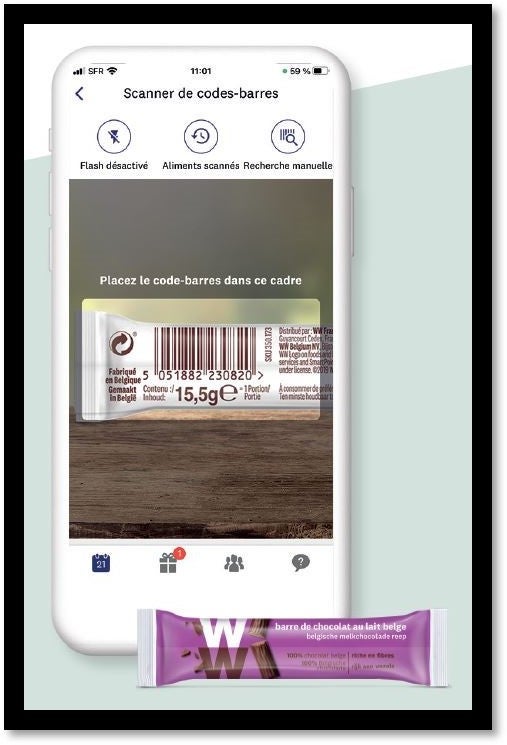 Lorsque vous faites vos courses, vous pouvez scanner le code-barre d’un produit afin d’obtenir sa valeur en Points. Sauvegardez-le, ajoutez-le en favori, ou intégrez-le directement dans vos aliments du jour. Vous verrez une liste de tous les produits que vous aurez scanné à laquelle vous pourrez vous référer rapidement si besoin.
