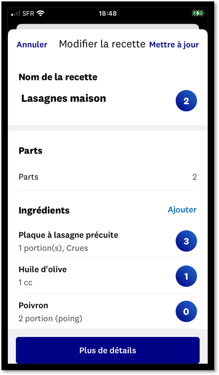 Vous mangez régulièrement le même repas (votre petit déjeuner, par exemple) ? Vous voulez savoir combien de Points représente le cassoulet à la graisse d'oie de votre tante Nicole (un indice : vous ne voulez pas réellement savoir) ? L’appli vous permet de créer vos propres recettes et repas, de les sauvegarder et de pouvoir les retrouver facilement pour les enregistrer rapidement à n’importe quel moment. Vous entrez vos ingrédients et votre nombre de part et hop, tout est calculé automatiquement. Vous pouvez ensuite faire des échanges malins ou chercher à diminuer les Points de votre recette si besoin. Simple et pratique !