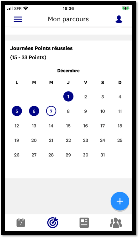 Vous êtes-vous demandé ce que représentaient les points bleus sur votre calendrier ? Ce sont vos "Journées réussies", et elles signifient que vous êtes sur la bonne voie. Vous les gagnez quand vous restez auout des vos Points journaliers, ni trop, ni trop peu ! Essayez de voir si vous pouvez obtenir une succession de Points bleus, puis partagez votre performance sur Connect !