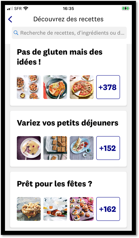 En tapotant sur les 3 traits en haut à gauche de votre journal de bord, et en tapotant "Recettes", vous découvrirez de délicieuses options pour toutes les occasions. Parcourez des idées de piques-niques, de recettes pour les fêtes ou de recettes italiennes, par exemple. Grosso modo, vous y trouverez toutes les choses qui vous régalent. Ce n'est pas parce que c'est une application perte de poids qu'il faut oublier le plaisir !