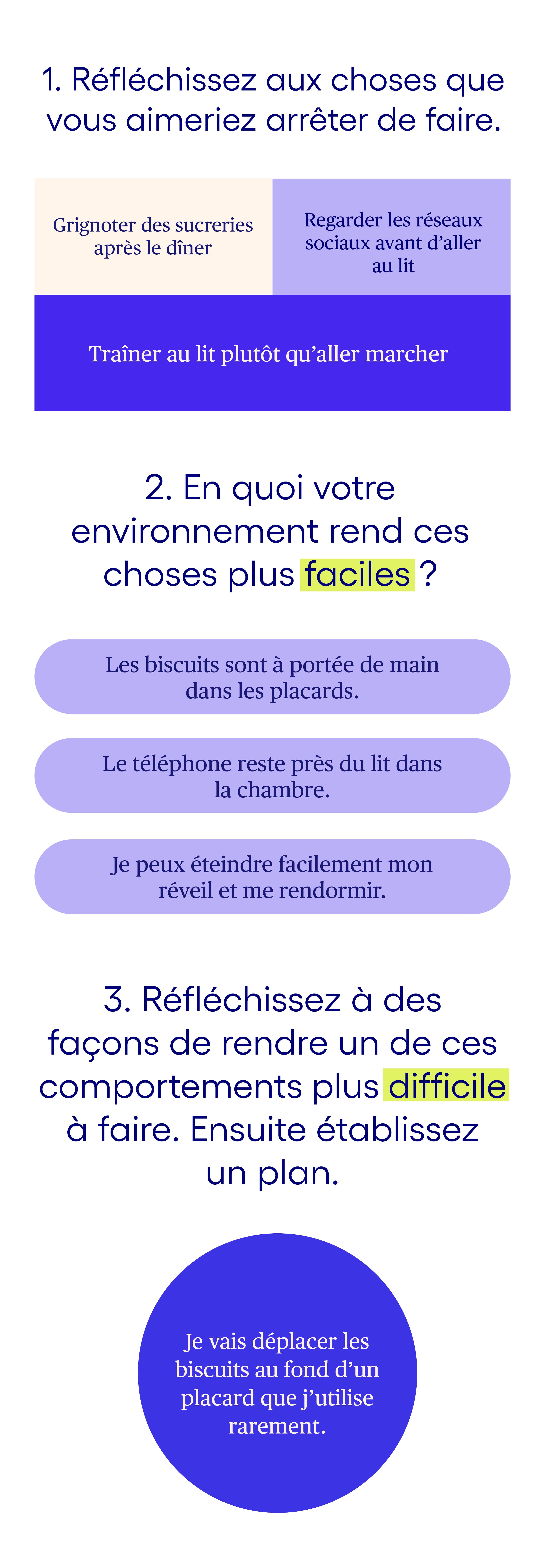 En pratique, cela peut être : emprunter un chemin différent pour rentrer chez vous pour éviter de passer devant un fast-food surtout si vous avez de quoi manger à la maison, portionner les sucreries pour s’en tenir à une portion, mettre votre téléphone en charge là où il est difficile de le regarder (sur votre commode plutôt que table de chevet).