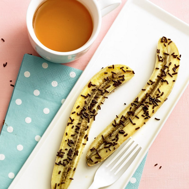 Couper la banane en 2 dans le sens de la longueur. La saupoudrer de vermicelles en chocolat. Faire tiédir quelques instants au four. La disposer sur une assiette et déguster avec un café.