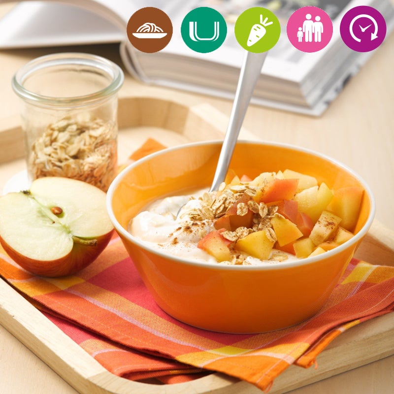 Dans un bol, mélanger un fromage blanc 0 %, 5 CS de flocons d'avoine et des dés de pommes. Accompagner d'un café.