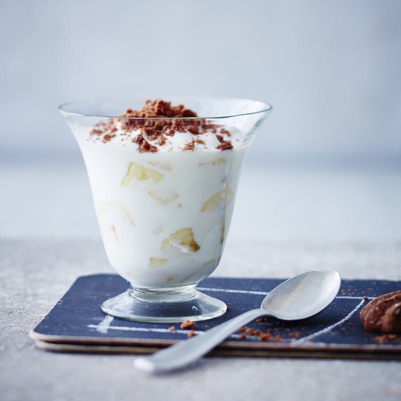 Découper une banane en rondelle dans un yaourt brassé 0% nature, saupoudrer d'1 CS de cacao en poudre non sucré.