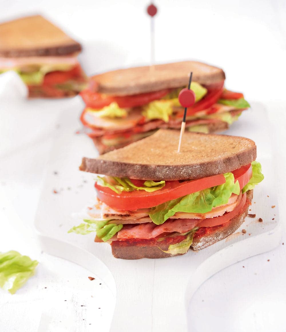 Faire griller le pain, le tartiner de harissa. Recouvrir le tout de laitue, de tomate, de jambon grillé et de poulet. Assaisonner. Verser un filet de jus de citron, puis recouvrir de la dernière tranche de pain.