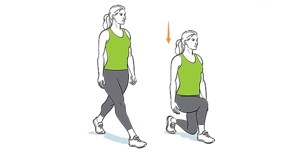 Laat je heupen zakken, buig je knieën totdat beide benen 90 graden zijn gebogen (dit lijkt op een uitvalpositie).