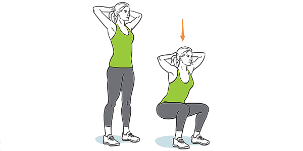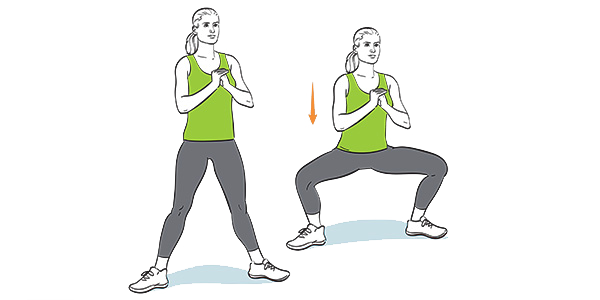 Duw heupen naar achteren en hurk neer, hou je borst omhoog en knieën naar buiten gekeerd.
