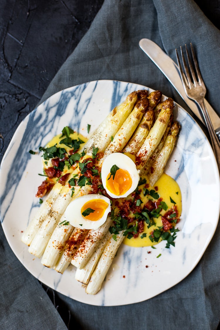 Sabine's gegrilde witte asperges met WW Hollandaise saus en chorizokruim