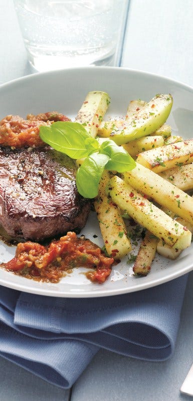 “Een heerlijk stuk ossenhaas, altijd lekker voor een feestelijk diner. De koolrabifriet kun je ook prima vervangen door zoete aardappelfriet, wel iets meer punten, maar zeker ook zo lekker.”