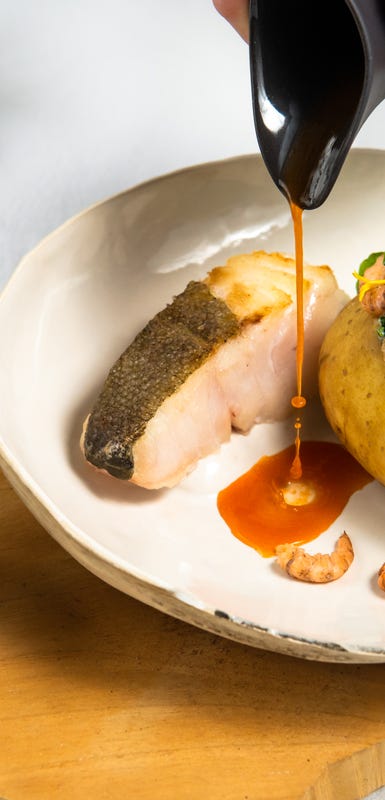1. Voeg voor de granaatappelcremeux 250 ml granaatappelsap, 250 ml lichte room, het sap van 2 citroenen en 60 g suiker samen in een pan en zet op het vuur. Wanneer dit bijna kookt, haal je het van het vuur af en voeg je de geweekte gelatine en de kleurstof toe.