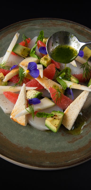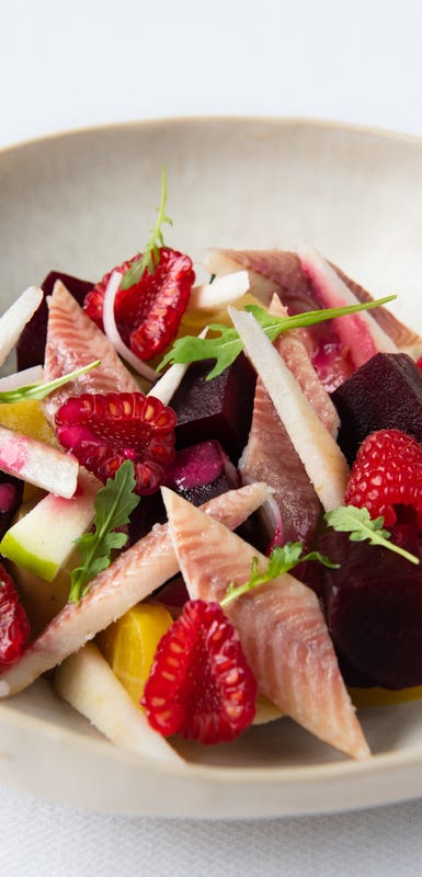 - Hou een paar frambozen apart en meng de rest met de yoghurt en rode bietensap en 20ml sushiazijn. Mix tot je een lopende vinaigrette krijgt en kruid af met peper en zout.