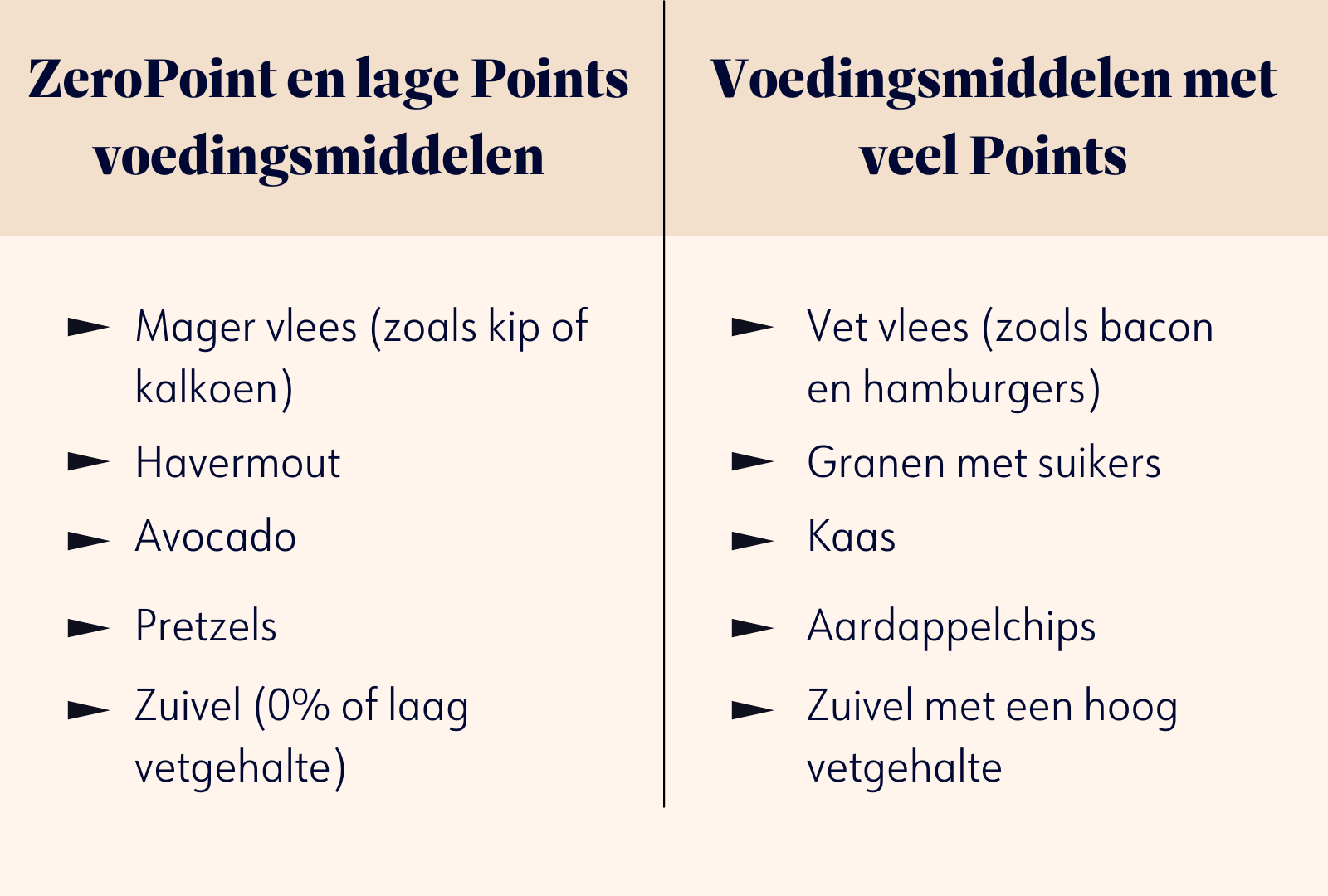 - De ZeroPoint® voedingsmiddelen. Deze supergezonde krachtpatsers (denk aan kipfilet, eieren, niet-zetmeelrijke groenten en meer) hebben - je raadt het al - 0 Points waarden. Je hoeft ze niet te wegen, af te meten of bij te houden. En dan kun je dus nog steeds afvallen!