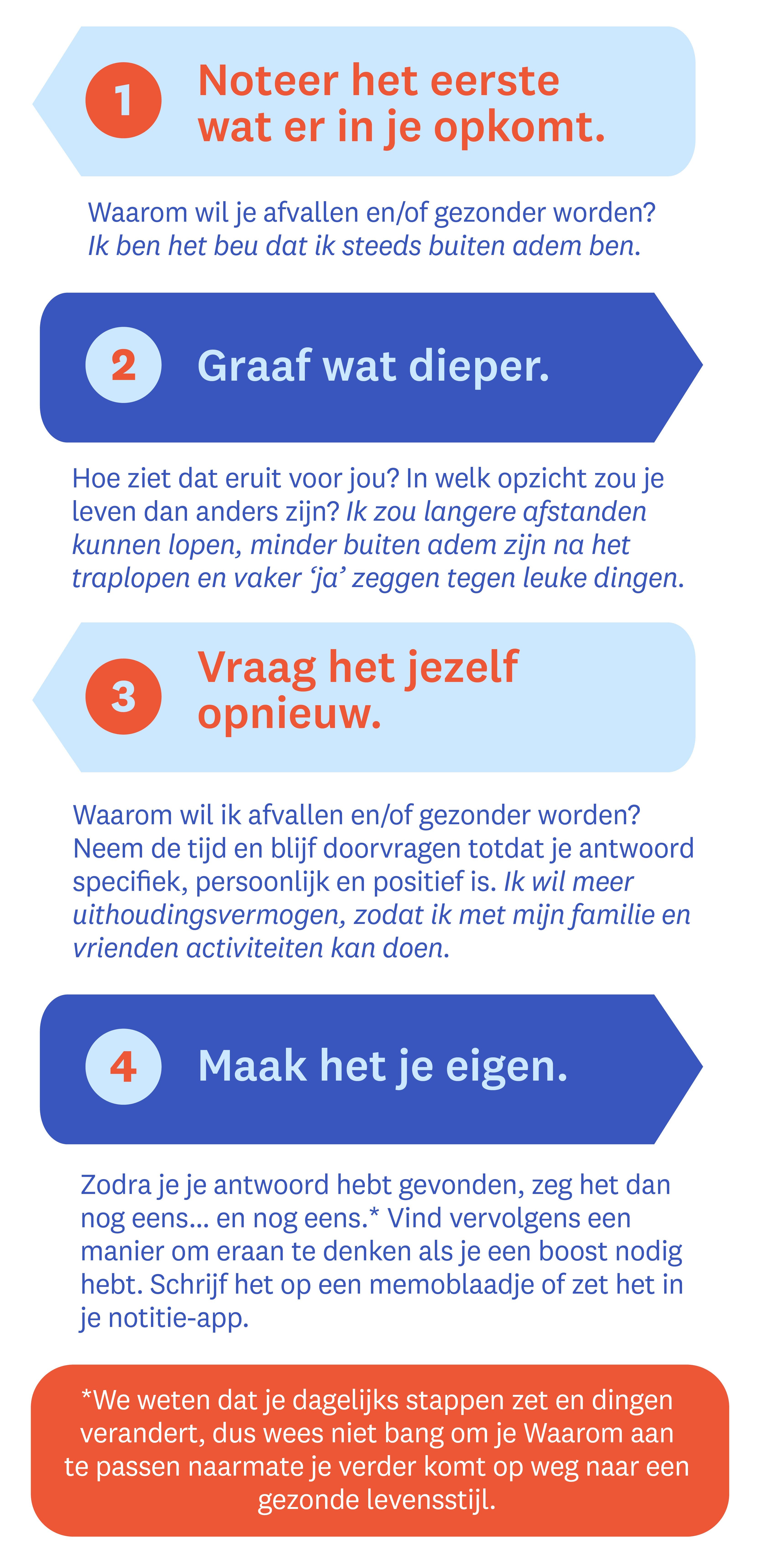 Begrijp ons niet verkeerd: doelen stellen is een belangrijk onderdeel van je weg naar een gezonde levensstijl, maar begrijpen waarom je die doelen wilt bereiken is net zo belangrijk. Wij noemen dit je Waarom. Het is de reden waarom je je doelen wilt bereiken en geeft aan wat voor jou het belangrijkst is. En die Waarom kan zo groot of zo klein zijn als je zelf wilt. Misschien wil je je zelfverzekerder voelen op het werk, genoeg energie hebben om met je kinderen te spelen, of gewoon je favoriete jeans weer kunnen dragen. Je bepaalt het helemaal zelf.