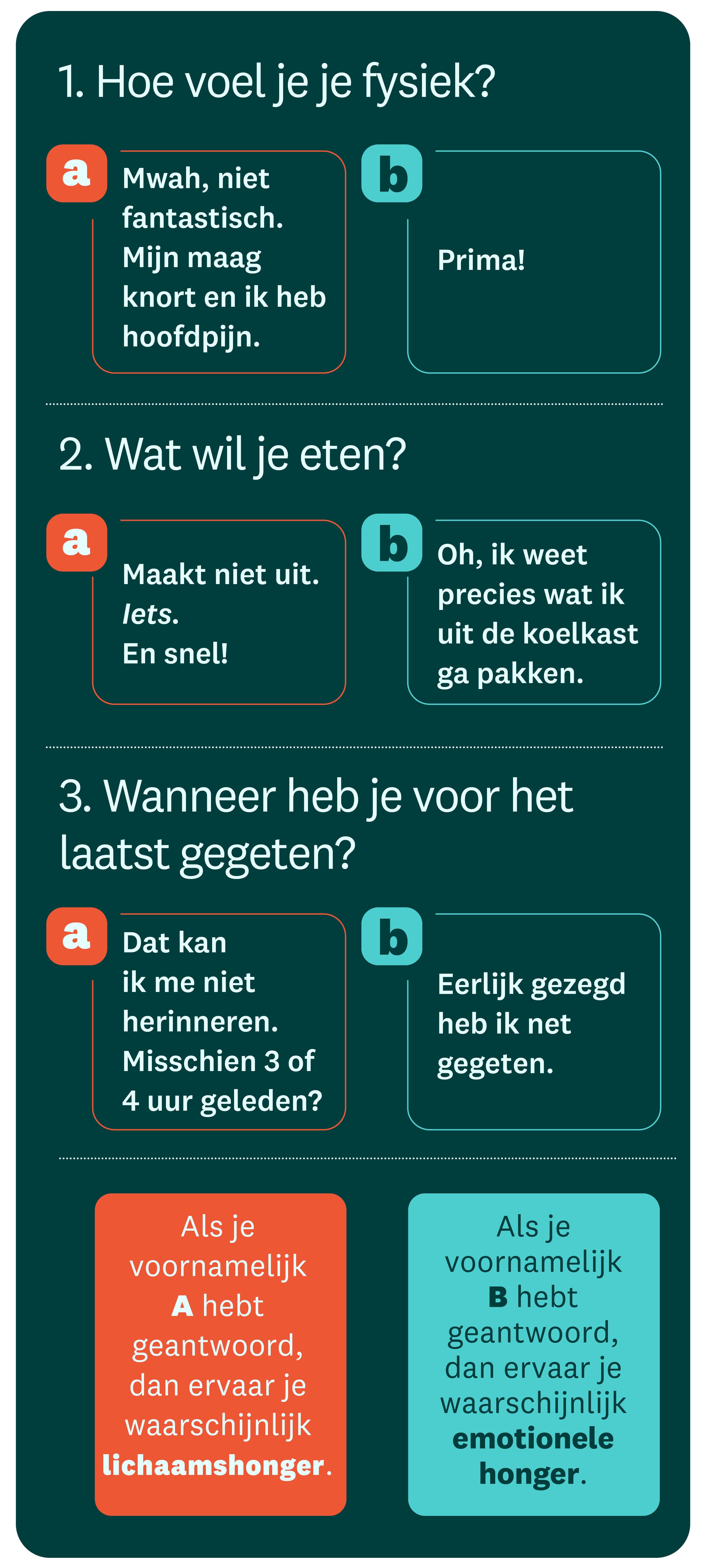 Je hoort ons niet zeggen dat je alleen op lichaamshongerprikkels mag reageren. Het is prima om een stuk taart te eten omdat deze in de koelkast staat of om van de stress een handje popcorn te eten tijdens een enge film. Door echter het verschil tussen lichaamshonger en emotionele honger te herkennen, kun je weloverwogen keuzes maken over wat je eet, hoeveel je eet en wanneer je eet.