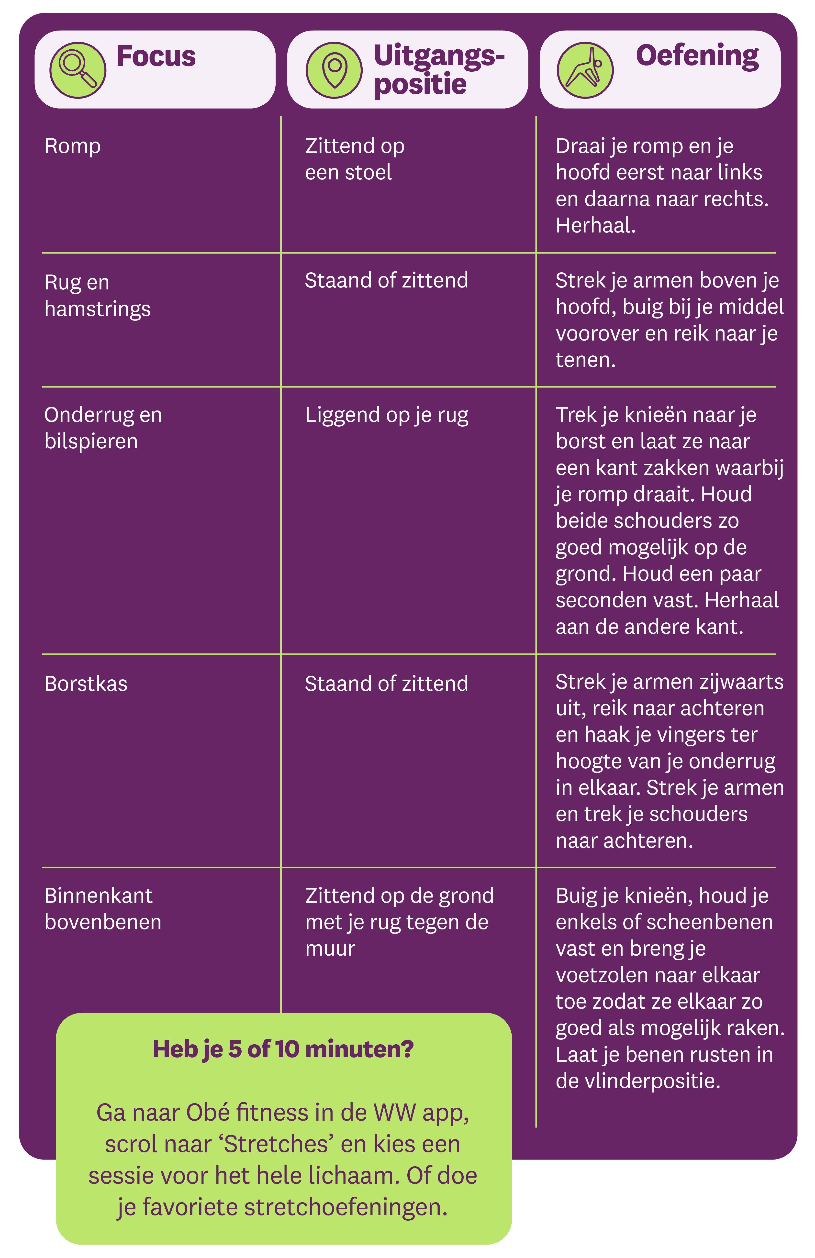 Heb je maar een of twee minuten? Doe een (of meer!) van de volgende stretchoefeningen.