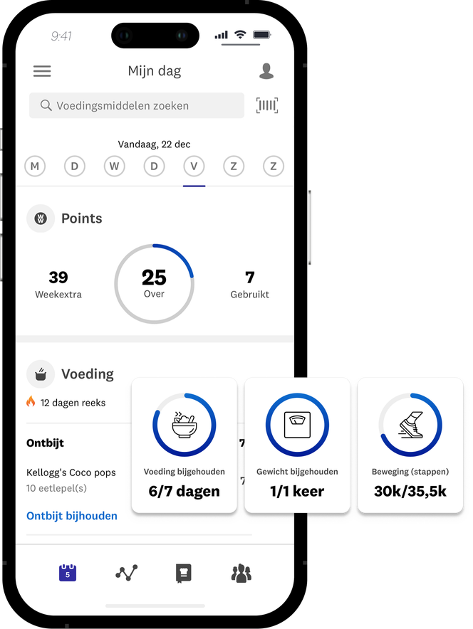 In een paar kliks kan je bijhouden wat je eet. Ons eenvoudige Points systeem helpt je voedzame voedingsmiddelen te kiezen die je dichter bij je doelen brengen.