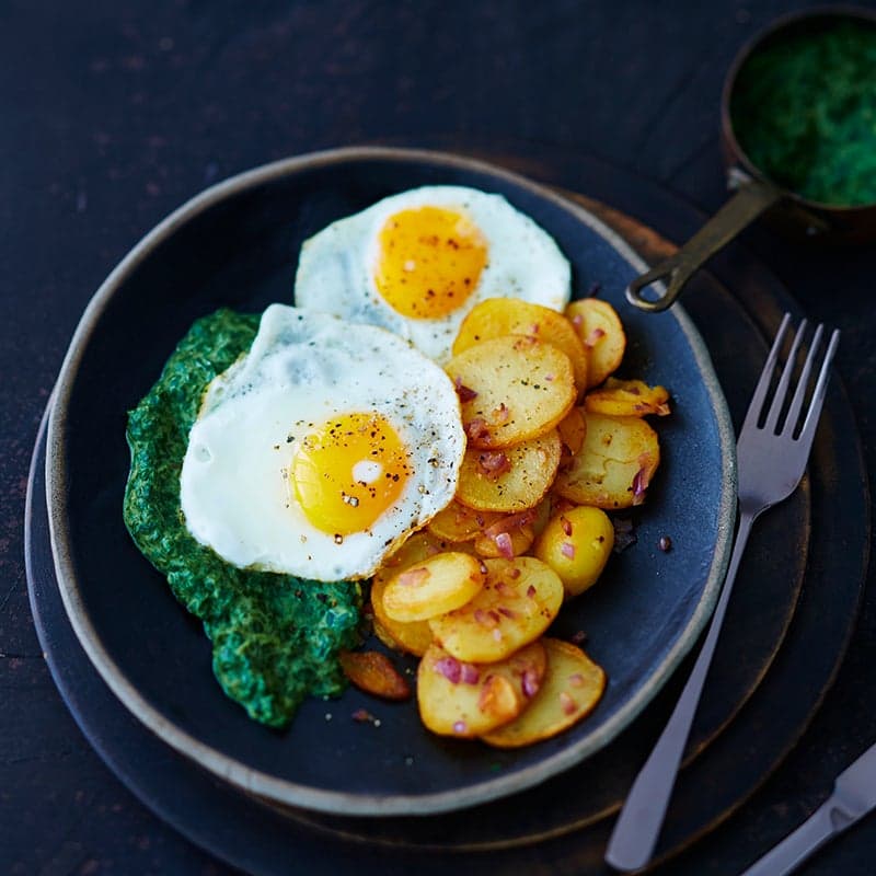 Bereid de spinazie zoals aangegeven op de verpakking en serveer met de gebakken aardappelen en spiegeleieren.