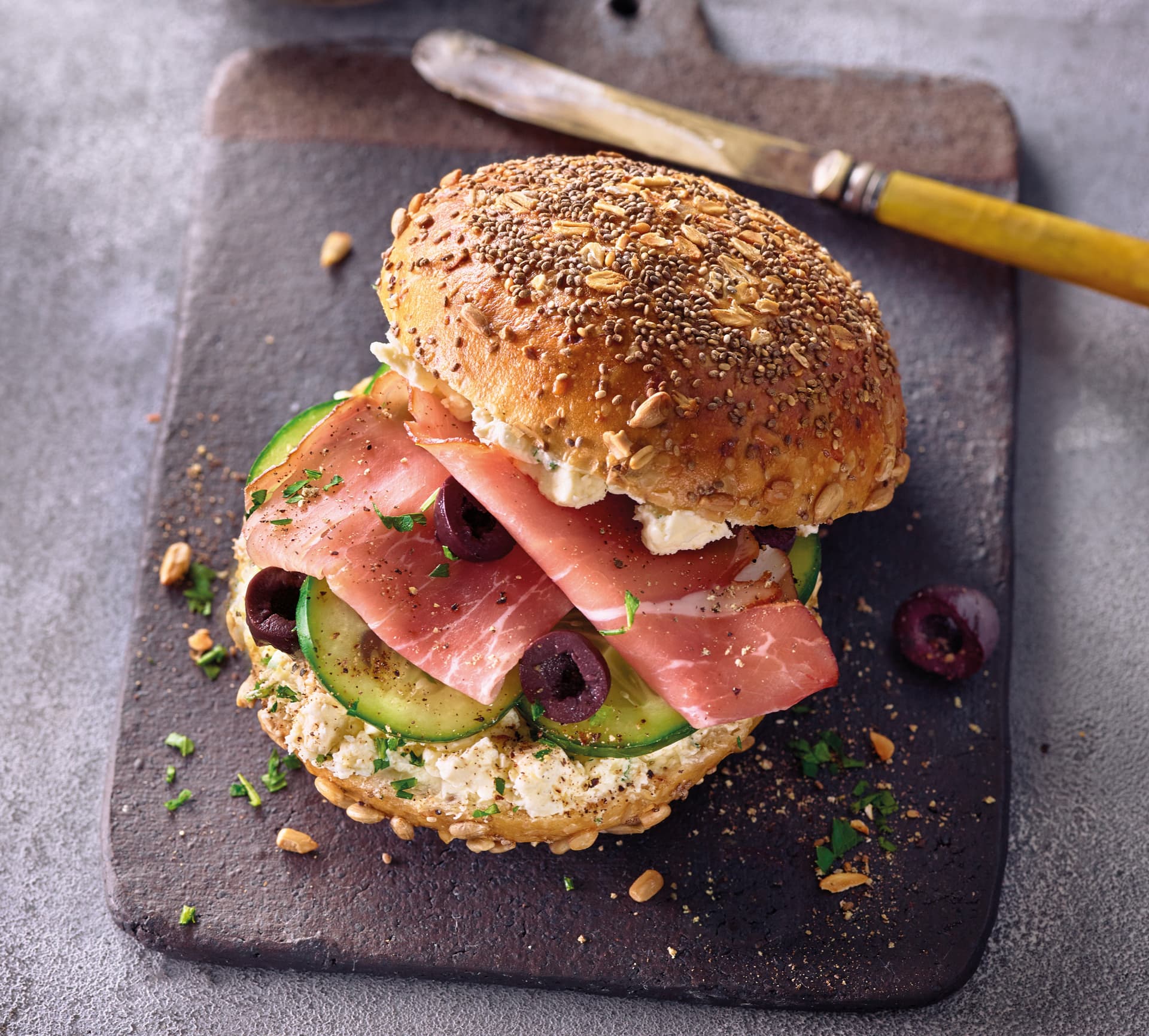 Snij het broodje open en bestrijk met de crème. Beleg deonderste helft met de komkommer, de ham en de olijven, leg de bovenste helft van het broodje erop en serveer.