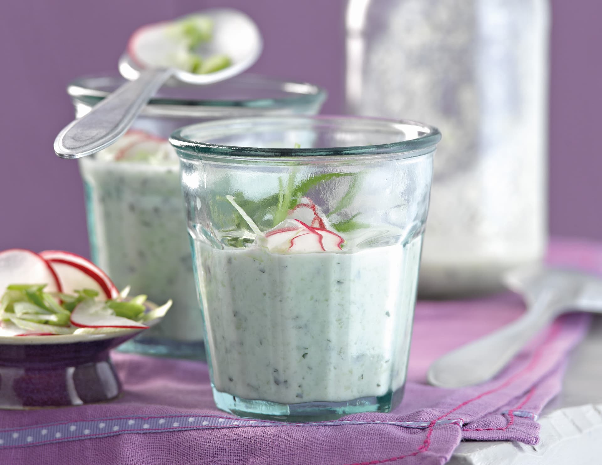 Was de radijsjes en schaaf in dunne plakjes. Was de lente-ui en snij in dunne ringetjes. Pureer de komkommer met de yoghurt, het citroensap en de geraspte citroenschil, breng op smaak met peper en zout en roer de munt erdoor. Garneer de soep met de radijs en de lente-ui en serveer.