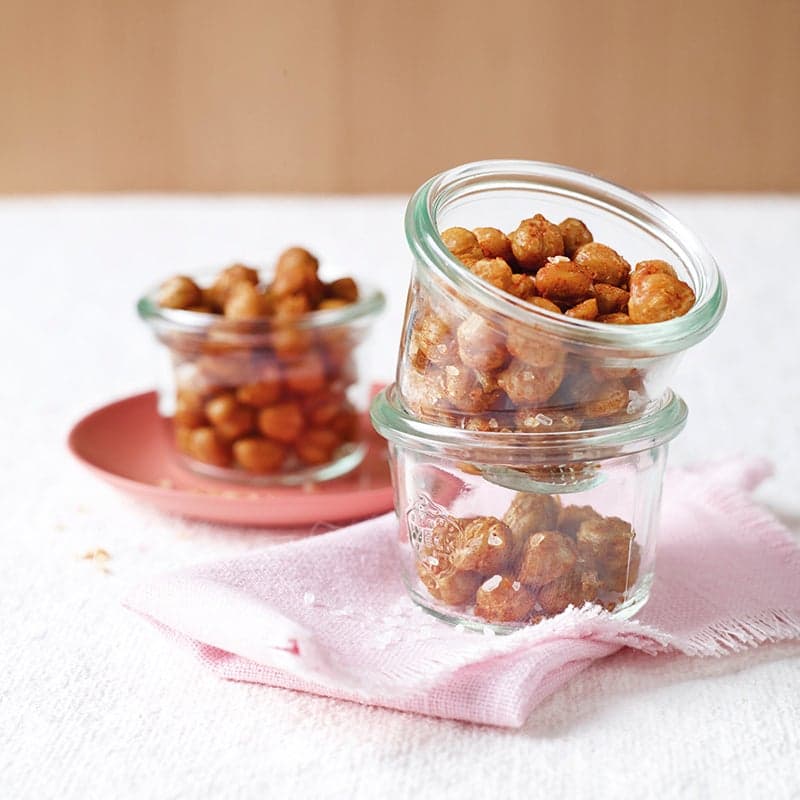 Verwarm de oven voor op 220 °C. Spoel de kikkererwten af en dep droog. Meng de kikkererwten met de olie, verdeel over een bakplaat en bak boven in de voorverwarmde oven in 20-25 minuten krokant. Schep om de 5 minuten om.
