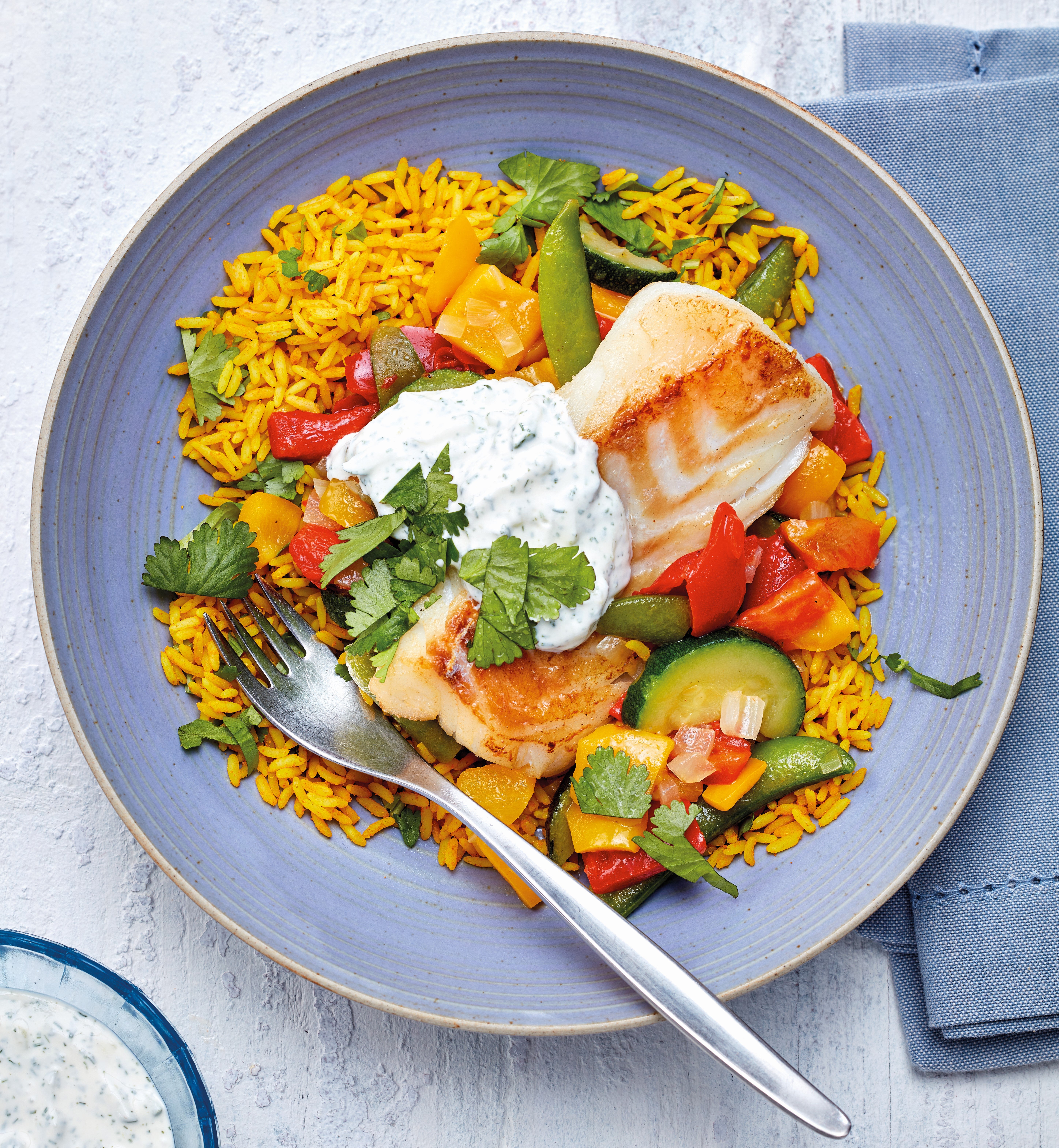 Schil voor de dip de komkommer en rasp fijn. Meng de komkommer met de yoghurt en de dille en breng op smaak met peper en zout. Voeg de rijst met de koriander toe aan de groenten en breng op smaak met het limoensap en zout. Leg de vis op het rijstpannetje en verwarm 2 minuten. Serveer met de yoghurtdip.