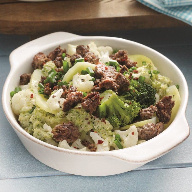 Verwarm de oven voor op 180 °C. Schil de aardappelen, snij in schijfjes en kook ca. 10 minuten voor. Kook de bevroren bloemkool en broccoliroosjes ca. 5-8 minuten in water voor.