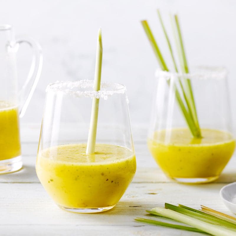 Verwijder de citroenbladen uit de cocktail en giet de cocktail in de glazen. Voeg aan ieder glas een stengel citroengras toe.