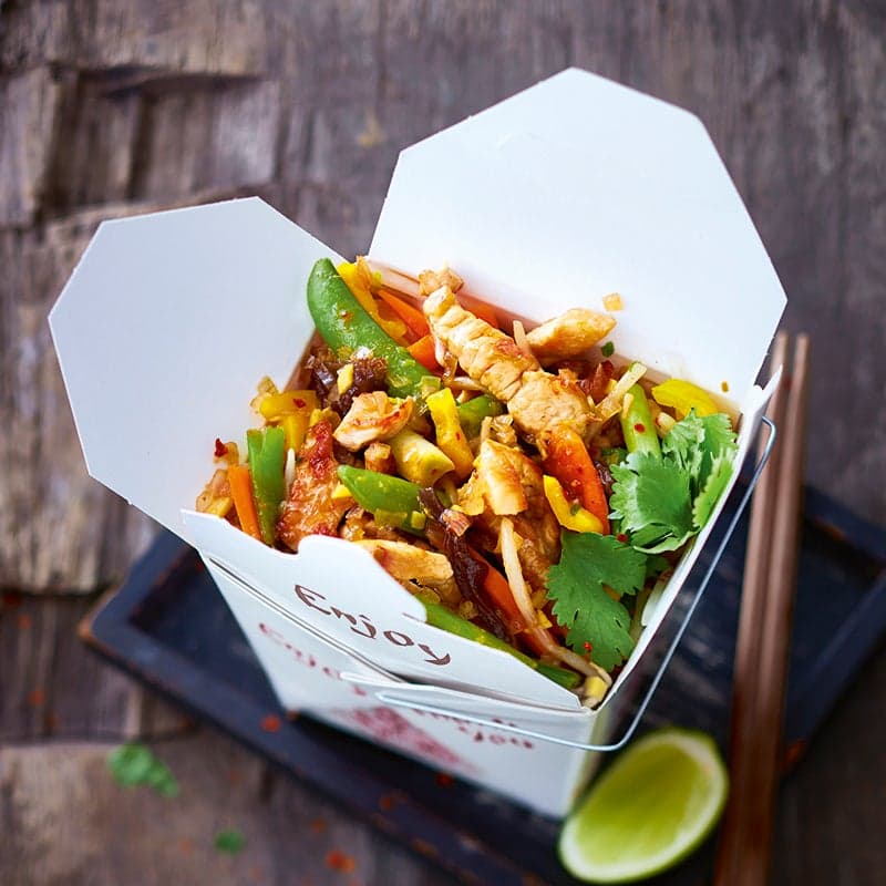 Rasp ½ koffielepel limoenschil en pers de limoen uit. Voeg de varkensreepjes toe aan de groenten en verwarm kort. Verfijn met sojasaus, limoensap, geraspte limoenschil en sambal oelek en breng op smaak met peper en zout.