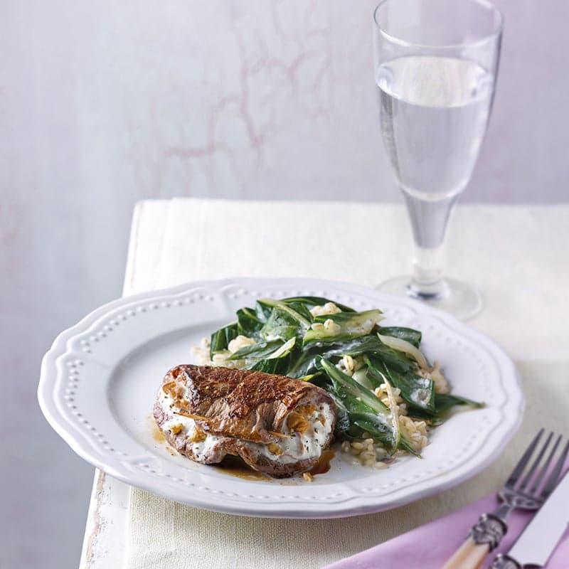Walnootsteaks met snijbiet en parelgort