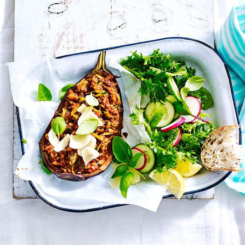 Celebrate the humble eggplant by stuffing them with lentils and zucchini for a vegetarian mid-week meal.