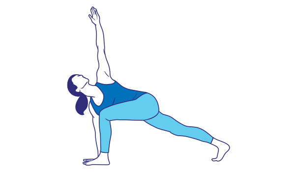 From tree pose, step your left foot back into a low lunge. Place both hands on your right thigh. Put your left hand down underneath your left shoulder by the inside of your right foot, and lift your right arm toward the ceiling for a gentle twist.