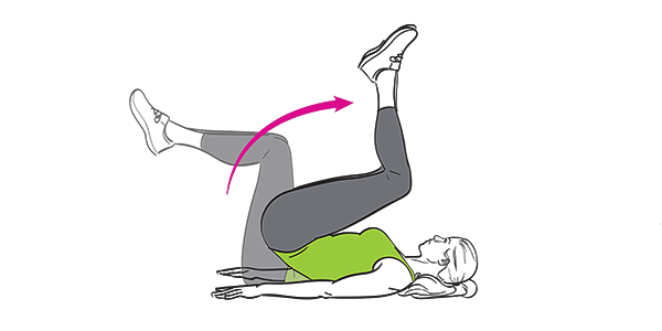 -Curl knees toward chest as you lift hips and lower back, then lower to start position to complete 1 rep. Do 15 reps.