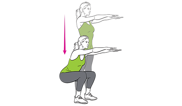 -Push hips back and bend knees, keeping back straight and squatting until thighs are parallel to the floor.