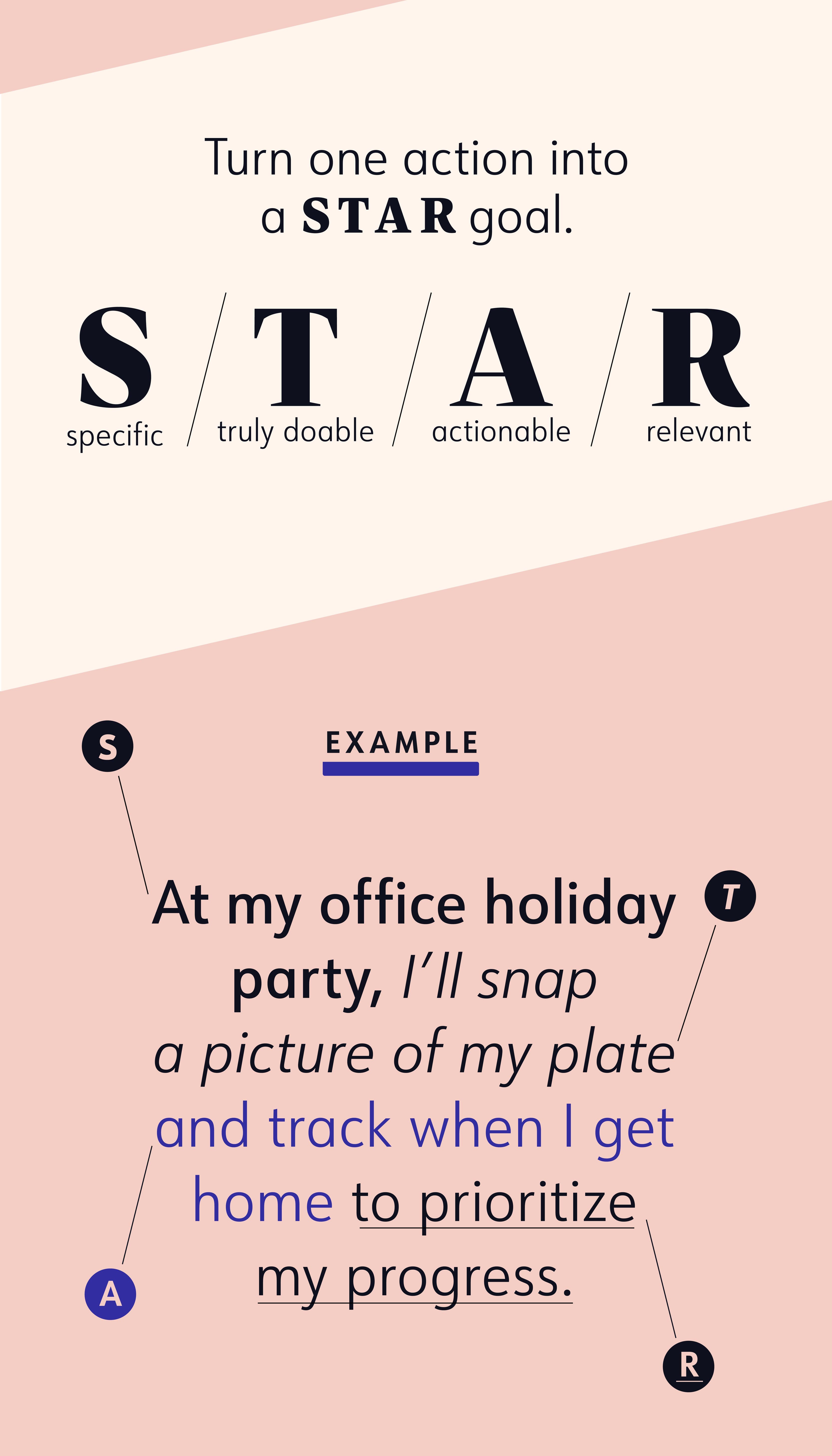 What helps: Thinking about your values—big-picture stuff like what matters to you most. Doing so lays the groundwork to then set and clarify an intention for how you want to finish the year and the actions you’ll take. In other words, think of a value as the ultimate destination. An intention provides a compass that points you toward that value. Naming specific actions gives you a map while STAR goals are turn-by-turn directions.