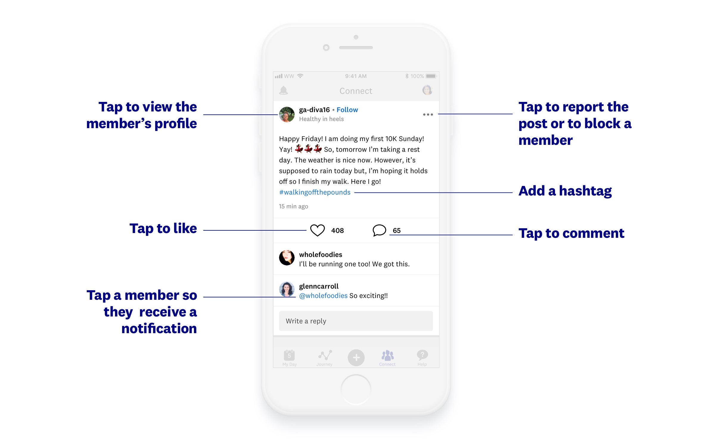 - Post photos or videos of your journey, such as recipes you love, moments that inspire you, and your successes along the way. Or, post a poll to get feedback from fellow members on whatever topic you'd like, from which outfit to wear to which recipe to try.