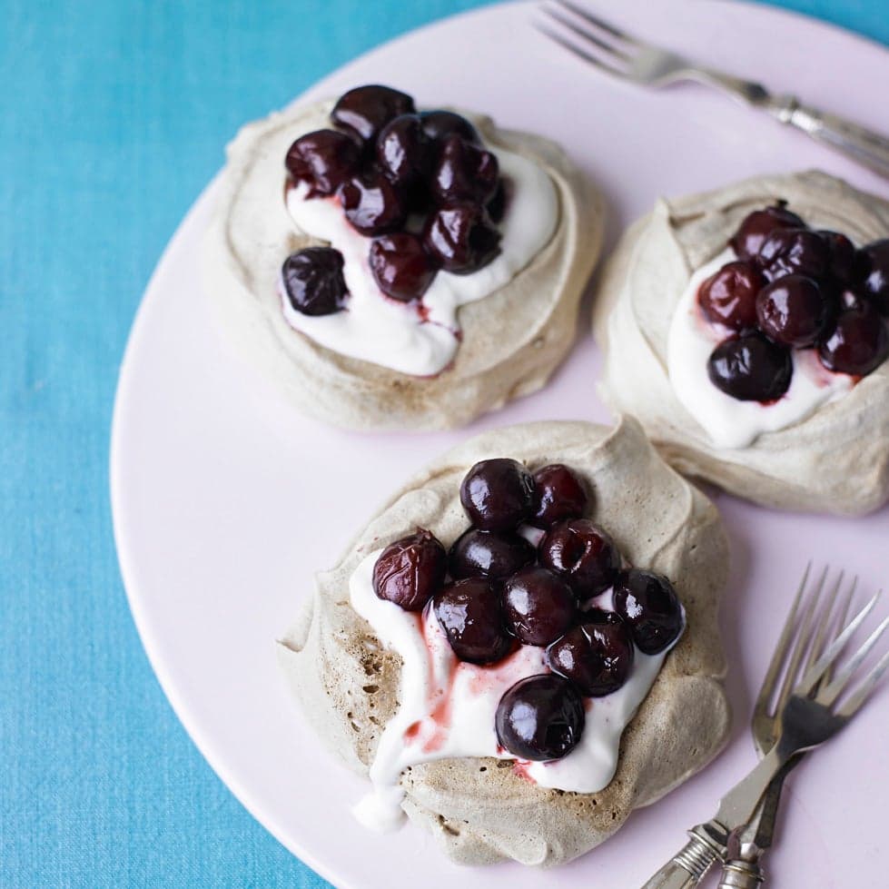 To serve, remove the meringues from the baking parchment and place on a serving plate. Put the cream in the middle of the meringues, top with the cherries and serve immediately.